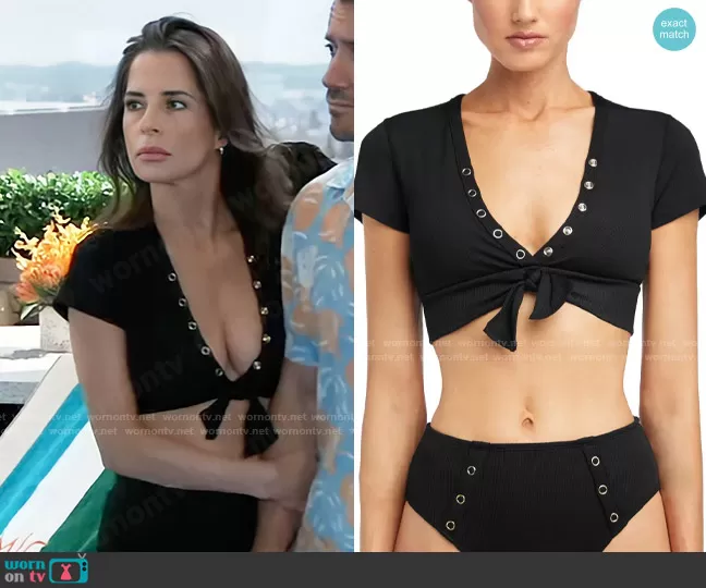Sam McCall (played by Kelly Monaco) on General Hospital on ABC was spotted wearing this black bikini top on General Hospital on Jun 02 2023's episode. Sam's Top is the Amy Crop Bikini Top by Robin Piccone .