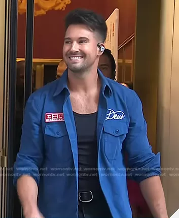 on Today on NBC was spotted wearing this blue embroidered shirt with patch on Today on Jun 02 2023's episode. 's Shirt is the Graphic-Print Cotton Shirt by Deus Ex Machina.