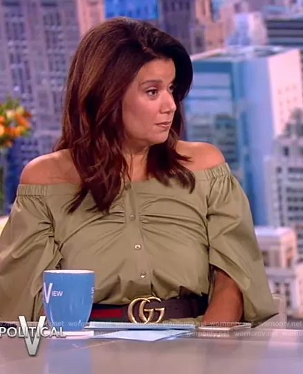 Ana Navarro on The View on ABC was spotted wearing this khaki off shoulder dress on The View on Jun 05 2023's episode. Ana's Dress is the Reese Off the Shoulder Stretch Cotton Shirtdress by Staud . Ana's Belt is the Nylon Calfskin Double G Web 40mm Belt by Gucci.