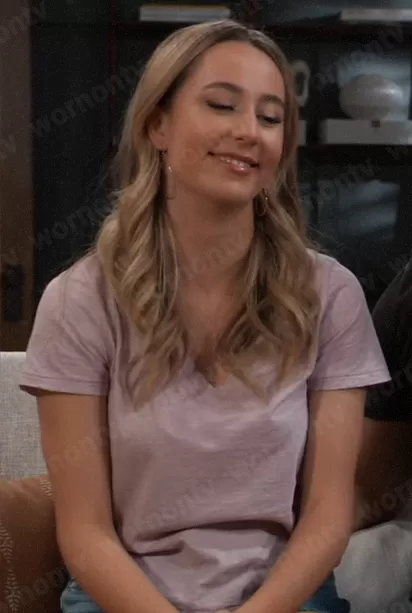 Josslyn Jacks (played by Eden McCoy) on General Hospital on ABC was spotted wearing this mauve v-neck tee on General Hospital on Jun 05 2023's episode. Josslyn's Top is the Whisper Cotton V-Neck Tee in Provence Grape by Madewell.