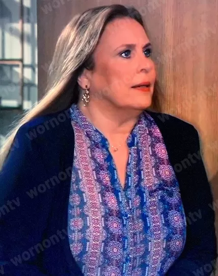 Laura Collins (played by Genie Francis) on General Hospital on ABC was spotted wearing this blue printed top on General Hospital on Jun 05 2023's episode. Laura's Top is the Jasmine Top by Kut from the Kloth .