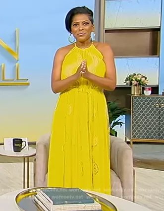 Tamron Hall on Tamron Hall Show on ABC was spotted wearing this yellow halter neck dress on Tamron Hall Show on Jun 05 2023's episode. Tamron's Dress is the Tiffany belted silk-georgette and lace halterneck maxi dress.