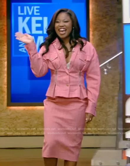 on Live with Kelly and Mark on Disney ABC Home Entertainment was spotted wearing this red zip detail jacket and skirt on Live with Kelly and Mark on Jun 05 2023's episode. 's Jacket is the Houndstooth Peplum Jacket by Versace . 's Skirt is the Red Houndstooth High Waisted Skirt by Versace.