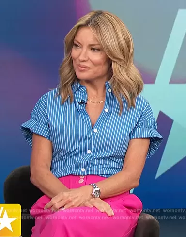 Kit Hoover on Access Hollywood on NBC was spotted wearing this blue striped short sleeve top on Access Hollywood on Jun 30 2023's episode. Kit's Shirt is the Cuffed Button Front Shirt by Frame.