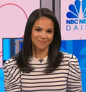 on NBC News Daily on NBC was spotted wearing this white striped ruched sleeve top on NBC News Daily on Jun 06 2023's episode. 's Sweater is the Ruched Striped Cashmere Sweater by Frame.