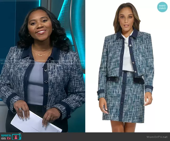 Calvin Klein Denim Trim Cropped Tweed Jacket worn by Kay Angrum on NBC News Daily