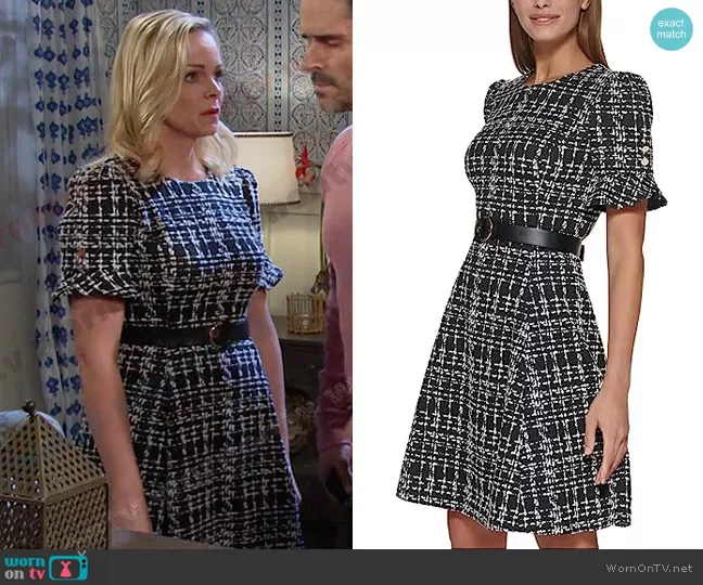 Belle Brady (played by Martha Madison) on Days of our Lives on Peacock was spotted wearing this black plaid dress on Days of our Lives on Jun 07 2023's episode. Belle's Dress is the Flounce Sleeve Fit and Flare with Belt Dress by DKNY.