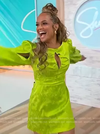 on Sherri on FOX was spotted wearing this lime floral cutout mini dress on Sherri on Jun 06 2023's episode. 's Dress is the Vogel Dress by Laagam.
