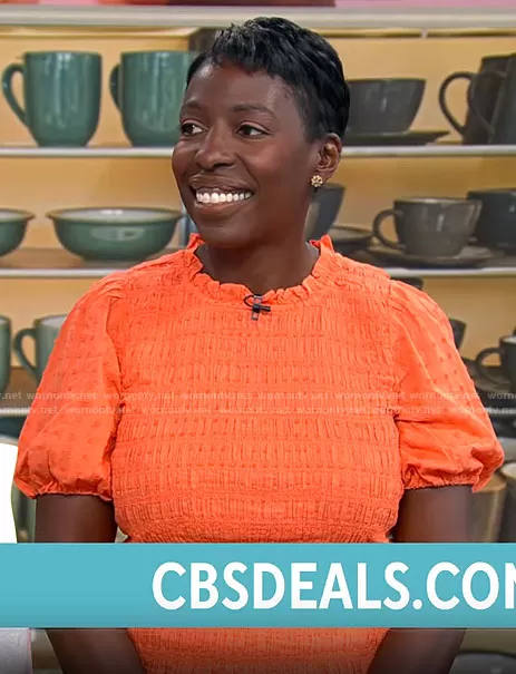 on CBS Mornings on CBS was spotted wearing this orange smocked top on CBS Mornings on Jun 07 2023's episode. 's Top is the Puff-sleeve textured voile smocked top in Fire Lily by J. Crew.
