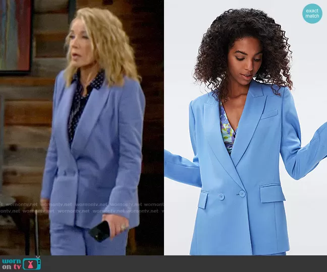 Nikki Reed Newman (played by Melody Thomas-Scott) on The Young and the Restless on CBS was spotted wearing this periwinkle blue suit on The Young and the Restless on Jun 07 2023's episode. Nikki's Jacket is the Salzburg Jacket in Periwinkle by Diane von Furstenberg . Nikki's Pants is the Barcelona Pants in Periwinkle by Diane von Furstenberg.