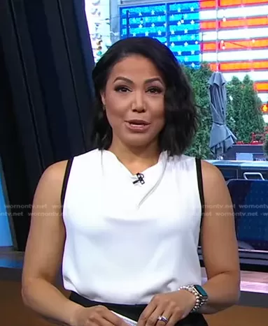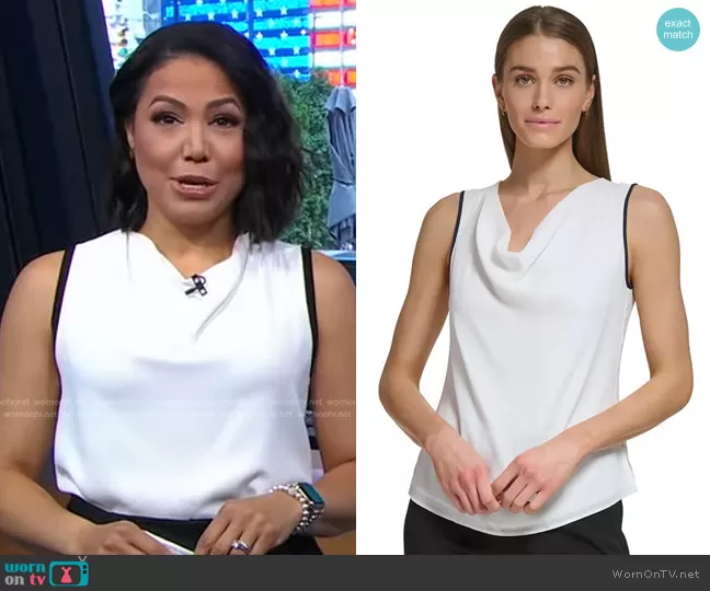 Stephanie Ramos on Good Morning America on ABC was spotted wearing this white cowl neck top on Good Morning America on Aug 21 2023's episode. Stephanie's Top is the Cowl Neck Sleeveless Contrast-Trim Blouse by DKNY.