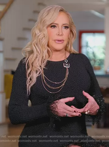Shannon Beador on The Real Housewives of Orange County on Bravo was spotted wearing this black textured confessional dress on The Real Housewives of Orange County on episode 'Here Comes the Judge' (17x01) in Jun 2023. Shannon's Dress is the Tulle trimmed dress by Saint Laurent.