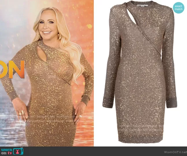 Shannon Beador on The Real Housewives of Orange County on Bravo was spotted wearing this metallic cutout intro dress on The Real Housewives of Orange County on episode 'Here Comes the Judge' (17x01) in Jun 2023. Shannon's Dress is the Sequin-embellished knitted dress by Stella McCartney.
