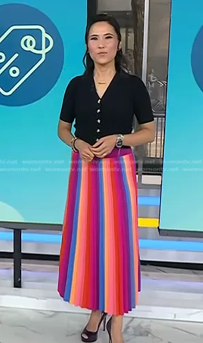 Vicky Nguyen on Today on NBC was spotted wearing this black star button cardigan and rainbow stripe skirt on Today on Jun 08 2023's episode. Vicky's Sweater is the Nolan Ribbed Star Button Cardigan by Sandro . Vicky's Skirt is the Rainbow Knit Midi Skirt by Banana Republic.