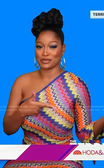 on Today on NBC was spotted wearing this zig zag print one-shoulder dress on Today on Jun 08 2023's episode. 's Dress is the Devon One-Shoulder Chevron Knit Mini Dress by Alexis .