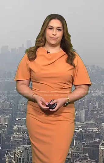 on Today on NBC was spotted wearing this orange cowl neck dress on Today on Jun 08 2023's episode. 's Dress is the Olivia Draped One-Shoulder Dress by Alexia Admor.