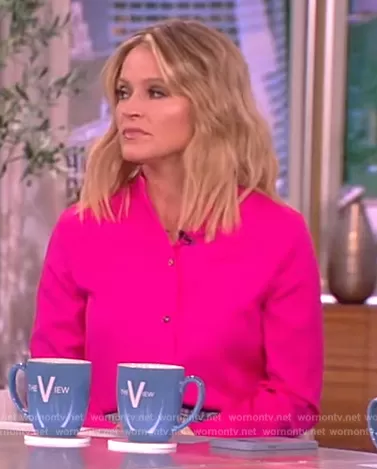 Sara Haines on The View on ABC was spotted wearing this pink button down blouse on The View on Jun 08 2023's episode. Sara's Top is the High-Low Button-Front Blouse by Agnona.