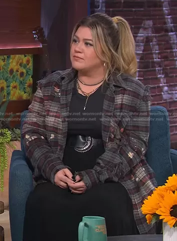 Kelly Clarkson on The Kelly Clarkson Show on NBC was spotted wearing this grey plaid bleached shirt on The Kelly Clarkson Show on Jun 08 2023's episode. Kelly's Top is the Bleached Flannel Shirt in Bleached Grey Plaid by R13 . Kelly's Belt is the Leather Belt by Etro.