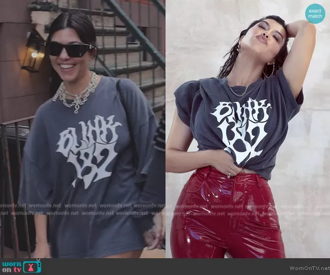 Kourtney Kardashian (played by Kourtney Kardashian) on The Kardashians on Hulu was spotted wearing this Blink 182 print tee and heart bag on The Kardashians on episode 'Everything is My Fault!' (3x03) in Jun 2023. Kourtney's Top is the Oversized Blink 182 T-Shirt by Boohoo . Kourtney's Bag is the Le Coeur leather shoulder bag by Alaia . Kourtney's Sunglasses is the X Hood By Air Antagonist Sunglasses Black by Gentle Monster.