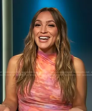 on Access Hollywood on NBC was spotted wearing this pink tie dye sleeveless top on Access Hollywood on Jun 08 2023's episode. 's Top is the Print Tulle Top by Zara.