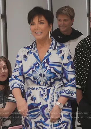 Kris Jenner (played by Kris Jenner) on The Kardashians on Hulu was spotted wearing this blue printed dress on The Kardashians on episode 'Everything is My Fault!' (3x03) in Jun 2023. Kris's Dress is the Majolica-print maxi shirt dress by Dolce and Gabbana.