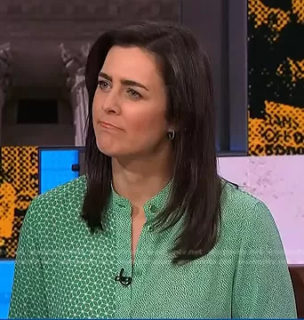 on NBC News Daily on NBC was spotted wearing this green mixed print blouse on NBC News Daily on Jul 19 2023's episode. 's Top is the Mixed-Print Covered-Placket Collarless Oxford Top by Anne Klein.