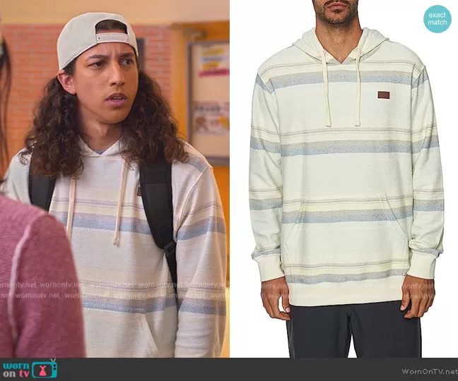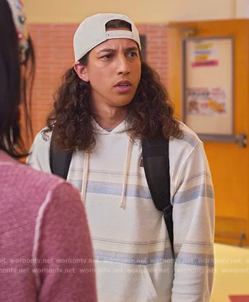 (played by Benjamin Norris) on Never Have I Ever on Netflix was spotted wearing this striped hoodie on Never Have I Ever on episode 'Lost My Virginity' (4x01) in Jun 2023. 's Sweater is the Bavaro Pullover Hoodie Sweatshirt by O'Neill.