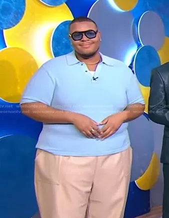 on Good Morning America on ABC was spotted wearing this blue polo shirt on Good Morning America on Jun 12 2023's episode. 's Shirt is the Terry-Knit Polo Shirt by Nanushka.