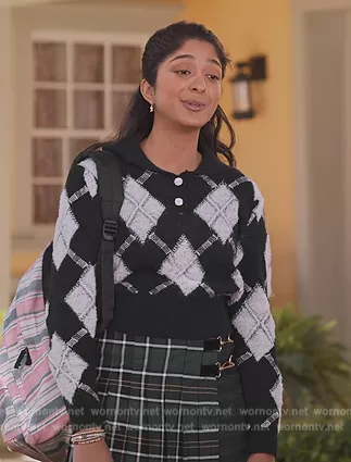 Devi Vishwakumar (played by Maitreyi Ramakrishnan) on Never Have I Ever on Netflix was spotted wearing this black argyle print sweater on Never Have I Ever on episode 'Lost My Virginity' (4x01) in Jun 2023. Devi's Sweater is the Book Smart Argyle Sweater by Dolls Kill . Devi's Skirt is the Jack Skirt in Green by Come On.