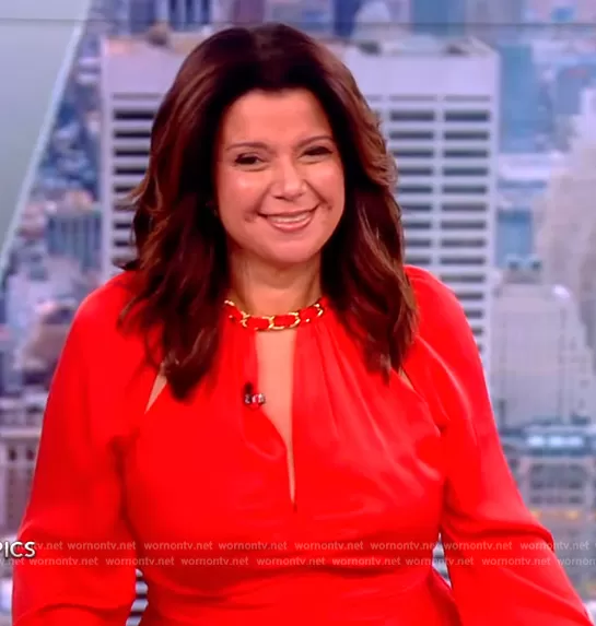 Ana Navarro on The View on ABC was spotted wearing this red chain neck blouse on The View on Jun 12 2023's episode. Ana's Top is the Yulita Cut-Out Silk-Blend Top by Veronica Beard.