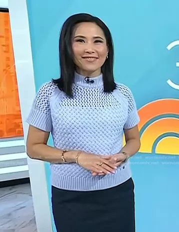 Vicky Nguyen on Today on NBC was spotted wearing this blue open knit sweater on Today on Dec 17 2025's episode. Vicky's Sweater is the Stena Basket Stitch Cotton Blend Sweater by Ted Baker.