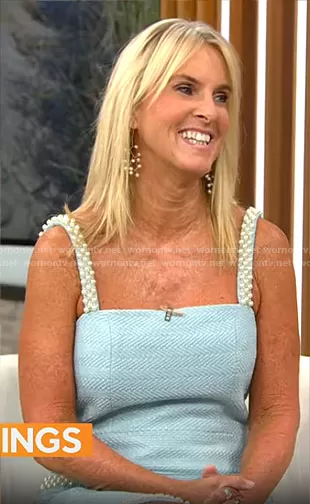 on CBS Mornings on CBS was spotted wearing this blue pearl embellished dress on CBS Mornings on Jun 13 2023's episode. 's Dress is the Ever Pearl-Embellished Tweed Minidress by Alexis .