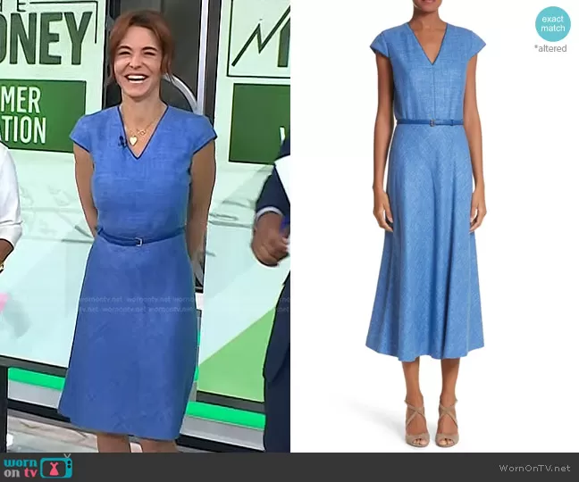 on Today on NBC was spotted wearing this blue belted v-neck dress on Today on Jun 13 2023's episode. 's Dress is the Caramba Midi Dress in Light Blue by Max Mara.