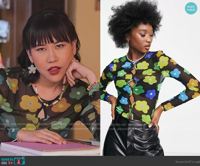 Eleanor Wong (played by Ramona Young) on Never Have I Ever on Netflix was spotted wearing this floral print mesh top on Never Have I Ever on episode 'Liked a Bad Boy' (4x03) in Jun 2023. Eleanor's Top is the Floral print mesh long sleeve top in multi by Topshop.