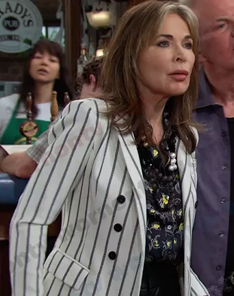 Kate Roberts (played by Lauren Koslow) on Days of our Lives on Peacock was spotted wearing this black floral blouse on Days of our Lives on Jun 14 2023's episode. Kate's Top is the Kirby Floral-Print Ruffle-Sleeve Button-Down Top by Cinq a Sept.