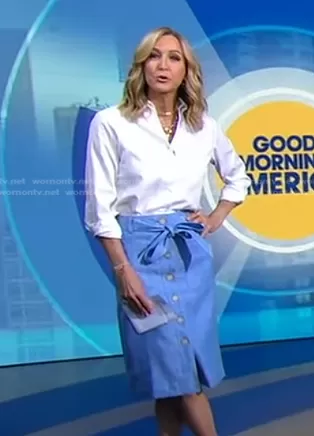 Lara Spencer on Good Morning America on ABC was spotted wearing this blue button front skirt on Good Morning America on Jun 14 2023's episode. Lara's Skirt is the Button-Front Skirt in stretch linen by J. Crew.