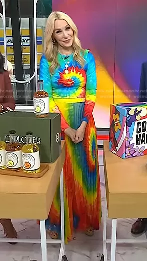 Chassie Post on Today on NBC was spotted wearing this rainbow tie dye top and skirt on Today on Jun 14 2023's episode. Chassie's Top is the Delaina Rainbow Tie Dye Crew Top by Alice + Olivia . Chassie's Skirt is the Shannon Tie-Dye Pleated Long Skirt by Alice + Olivia.