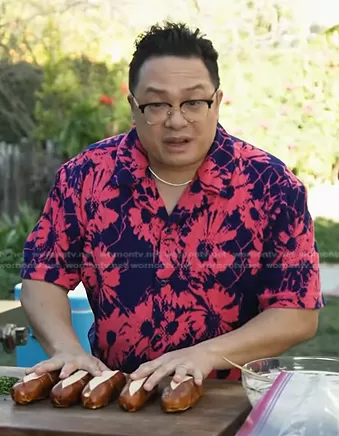 on Access Hollywood on NBC was spotted wearing this navy and pink floral print shirt on Access Hollywood on Jun 14 2023's episode. 's Shirt is the Quinn Jacquard Shirt in Pink by Urban Outfitters.
