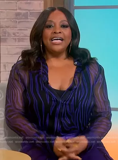 Sherri Shepherd on Sherri on FOX was spotted wearing this purple zebra stripe blouse and pants on Sherri on Jun 14 2023's episode. Sherri's Top is the Zebra Print Shirt by Versace . Sherri's Pants is the Satin Cargo Pants by Versace.