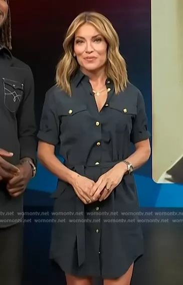 Kit Hoover on Access Hollywood on NBC was spotted wearing this navy tie waist shirtdress on Access Hollywood on Nov 02 2023's episode. Kit's Dress is the Roxanne Mini Dress by Rag & Bone.