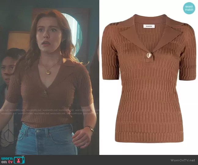 Nancy Drew (played by Kennedy McMann) on Nancy Drew on The CW was spotted wearing this brown ribbed polo top on Nancy Drew on episode 'The Danger of the Hopeful Sigil' (4x03) in Jun 2023. Nancy's Top is the Victor Rib-Knit Sweater by Sandro.