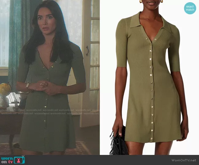 Bess (played by Maddison Jaizani) on Nancy Drew on The CW was spotted wearing this green ribbed button front mini dress on Nancy Drew on episode 'The Danger of the Hopeful Sigil' (4x03) in Jun 2023. Bess's Dress is the Rimose Rib-Knit Mini Dress in Khaki by Maje.