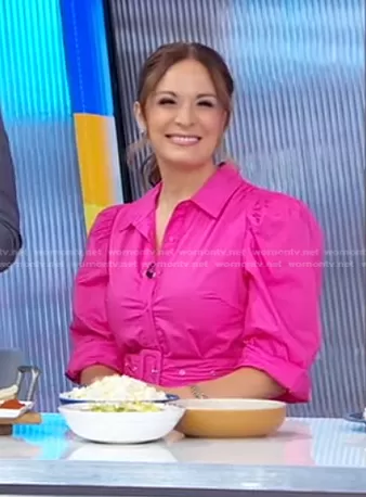 on Good Morning America on ABC was spotted wearing this hot pink belted shirtdress on Good Morning America on Jun 15 2023's episode. 's Dress is the Tara Puff Sleeve Belted Shirt Dress in Pink by Walter Baker.