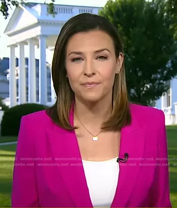Mary Bruce on Good Morning America on ABC was spotted wearing this Mary’s pink blazer on Good Morning America on Oct 01 2024's episode. Mary's Jacket is the Hudson Crepe Blaze in Hot Pink by Generation Love.