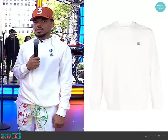 on Today on NBC was spotted wearing this white sweatshirt and printed jeans on Today on Jun 15 2023's episode. 's Sweater is the Logo-Patch Sweatshirt by Moncler . 's Pants is the Bridgetown Mrdr Moto Denim Jean Sky by Who Decides War . 's Hat is the Chance 3 New Era Baseball Cap by Chance The Rapper.