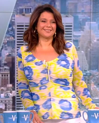 Ana Navarro on The View on ABC was spotted wearing this floral print ruched front top on The View on Jun 16 2023's episode. Ana's Top is the Ruched Mesh Top by Ganni.