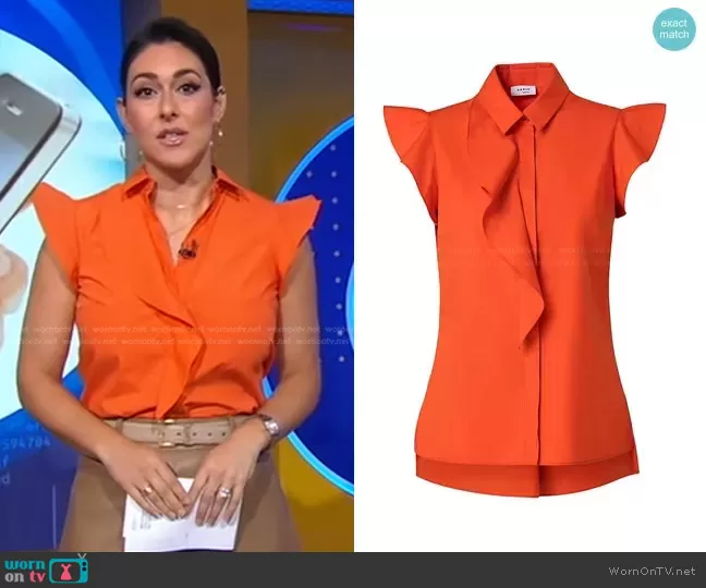 Erielle Reshef on Good Morning America on ABC was spotted wearing this orange ruffle blouse on Good Morning America on Nov 29 2024's episode. Erielle's Top is the Ruffle-Embellished Blouse by Akris Punto.