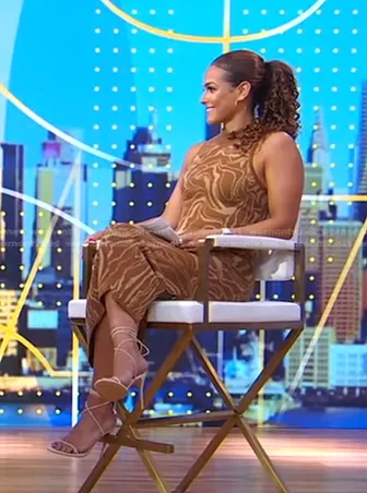 on Good Morning America on ABC was spotted wearing this brown marble print dress on Good Morning America on Jun 19 2023's episode. 's Dress is the Paloma Midi Dress by Heartloom.
