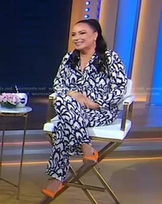 on Good Morning America on ABC was spotted wearing this black and white printed top and pants on Good Morning America on Jun 19 2023's episode. 's Top is the Printed Silk Shirt by The Kooples . 's Pants is the Feathers Silk Pants by The Kooples.