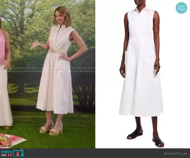 Savannah Guthrie on Today on NBC was spotted wearing this Savannah’s white sleeveless shirtdress and sandals on Today on Jun 18 2023's episode. Savannah's Dress is the Sleeveless Maxi Shirtdress with Pockets by Co . Savannah's Shoes is the Fae Platform Heel Sandals by Loeffler Randall.